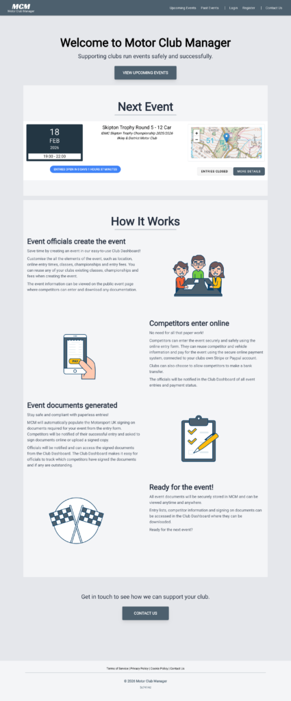 A SaaS platform helping motor clubs run events safely and successfully, featuring online entry forms, secure payment processing, and automatic Motorsport UK document generation.